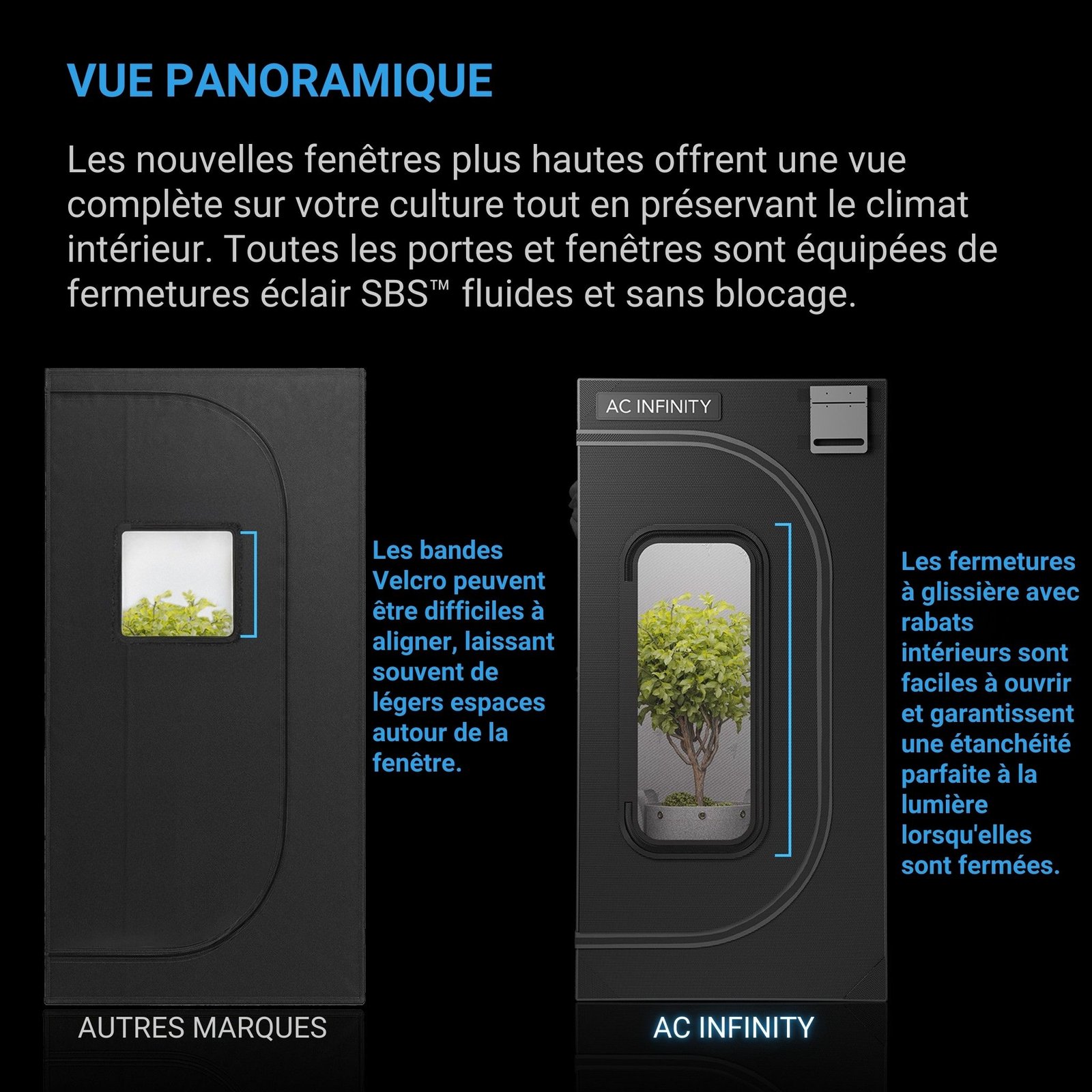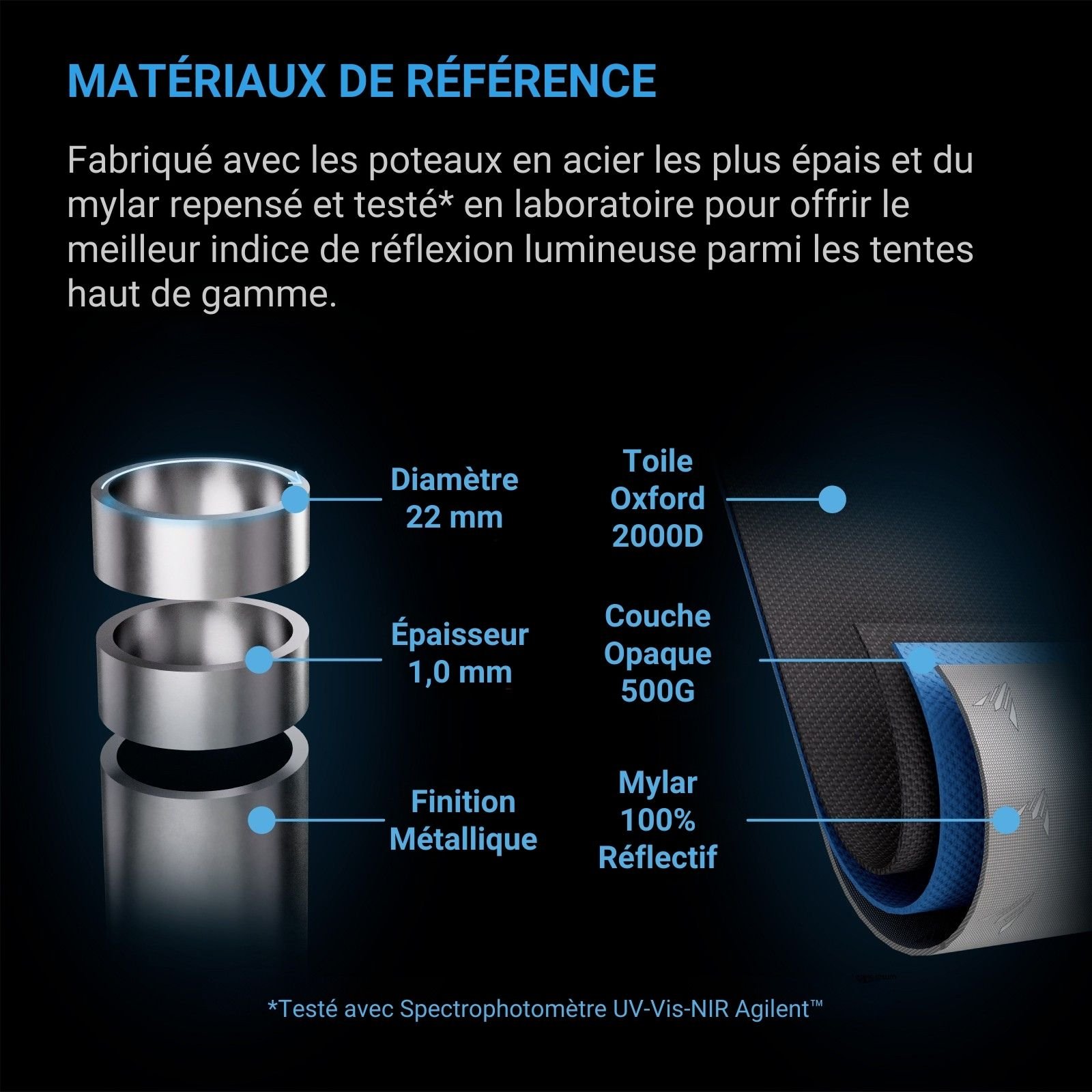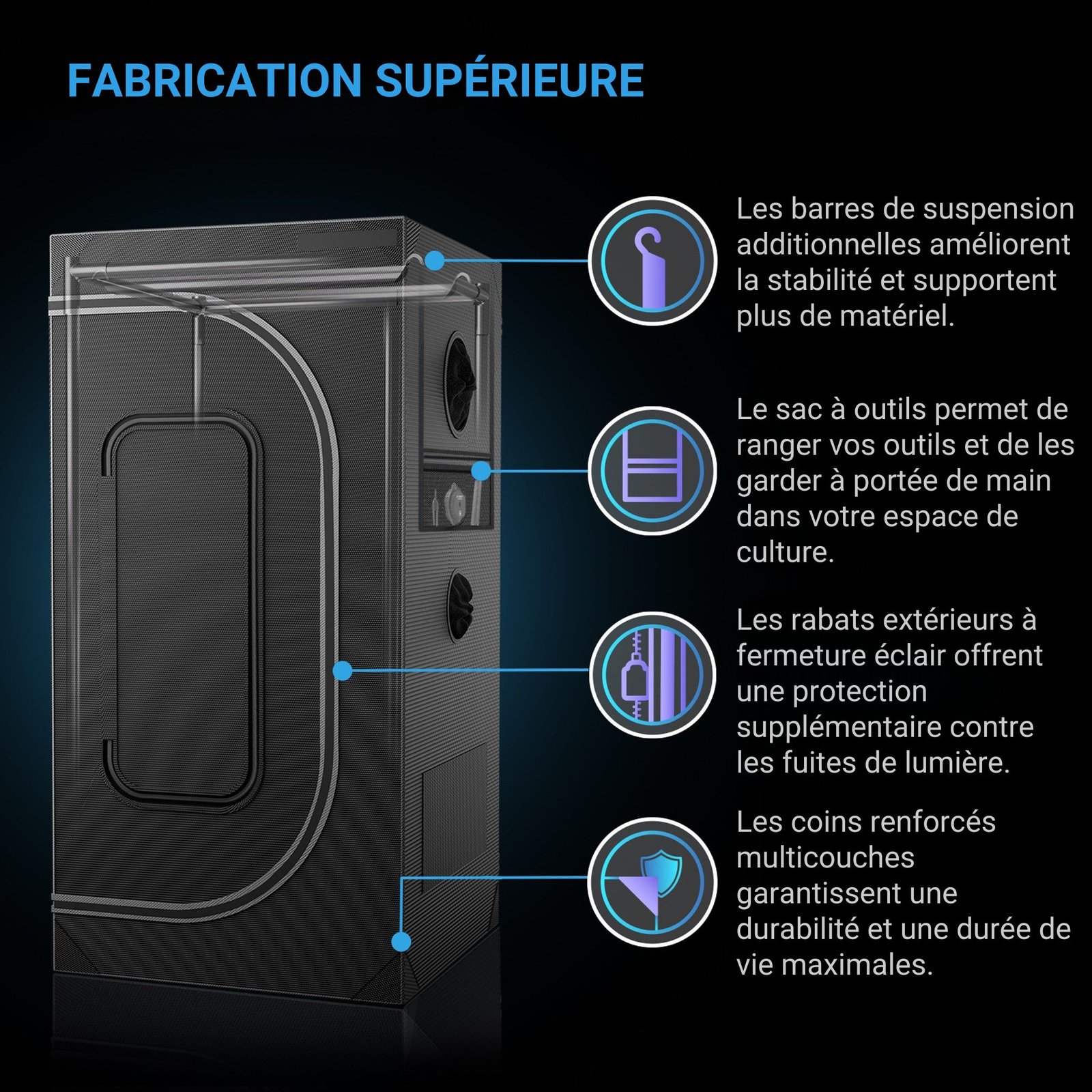 - Poteaux en acier de 22 mm ultra-résistants, toile 2000D ultra-épaisse, mylar repensé et testé en laboratoire pour offrir la meilleure réflectivité lumineuse parmi toutes les tentes de culture.