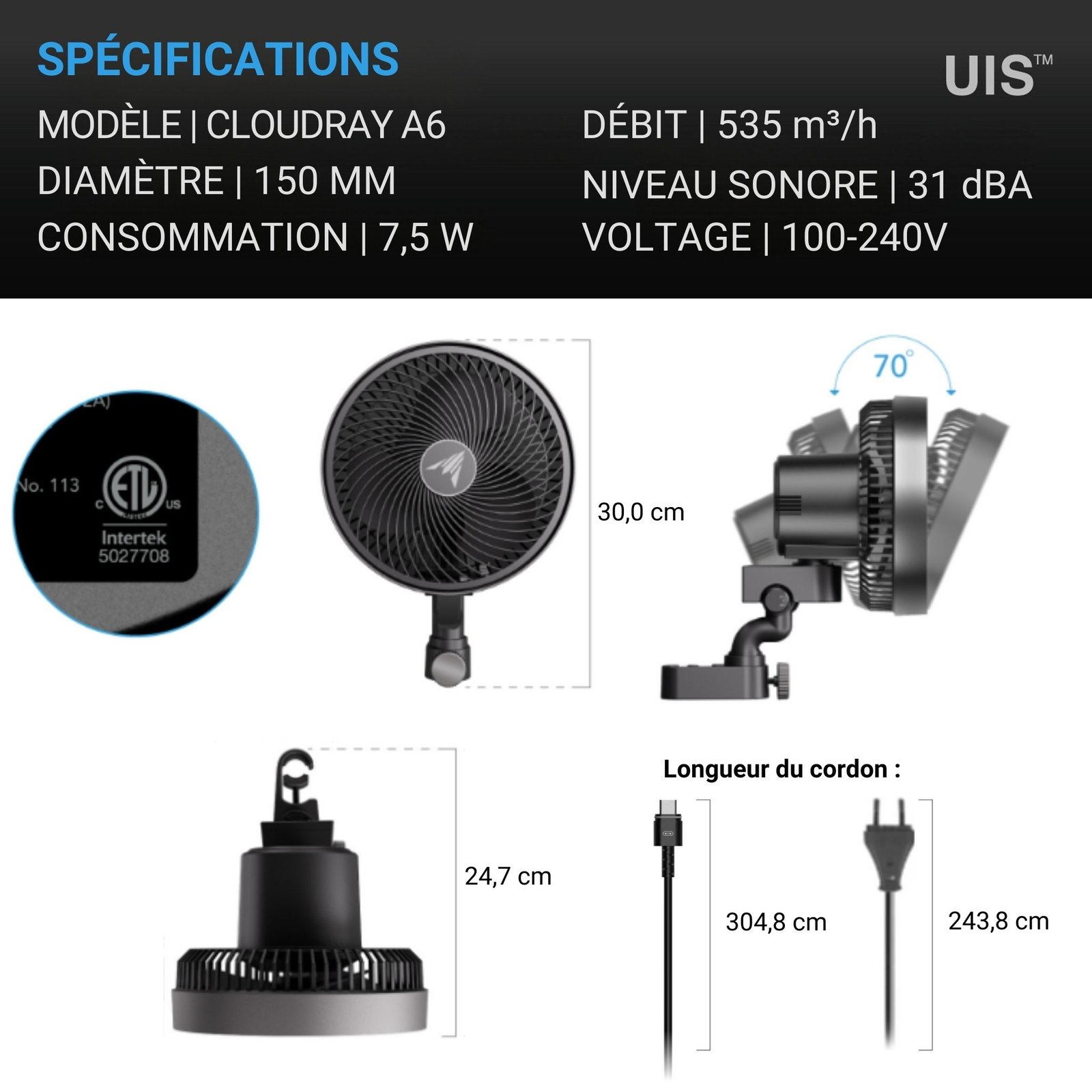 1 avis pour AC INFINITY CLOUDRAY A6, Ventilateur à pince pour tente de culture 150 mm avec 10 vitesse, moteur EC, pivotement manuel