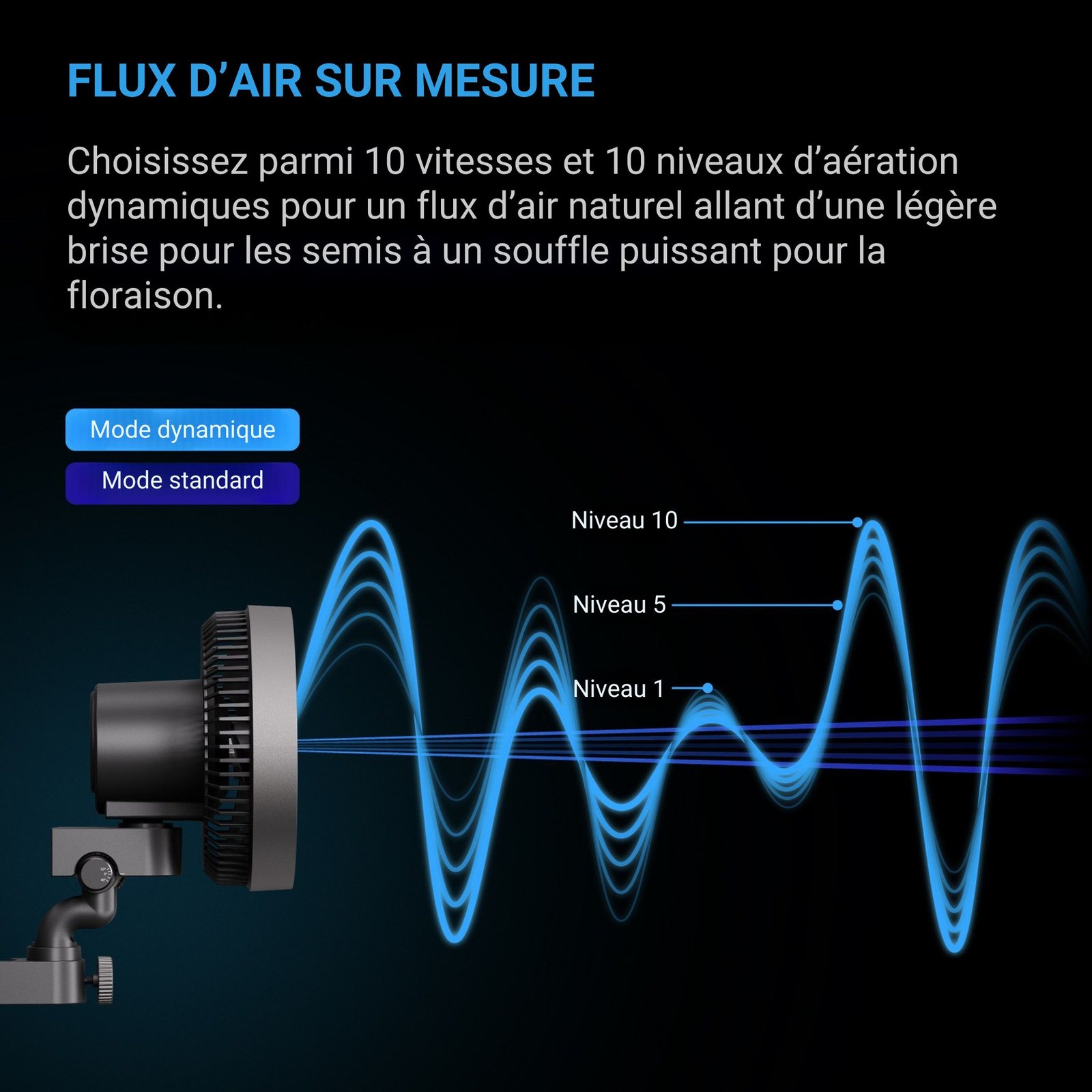 - Variateur numérique 10 vitesses, allant d’une légère brises pour les semis jusqu’à un flux d’air puissant pour la floraison.