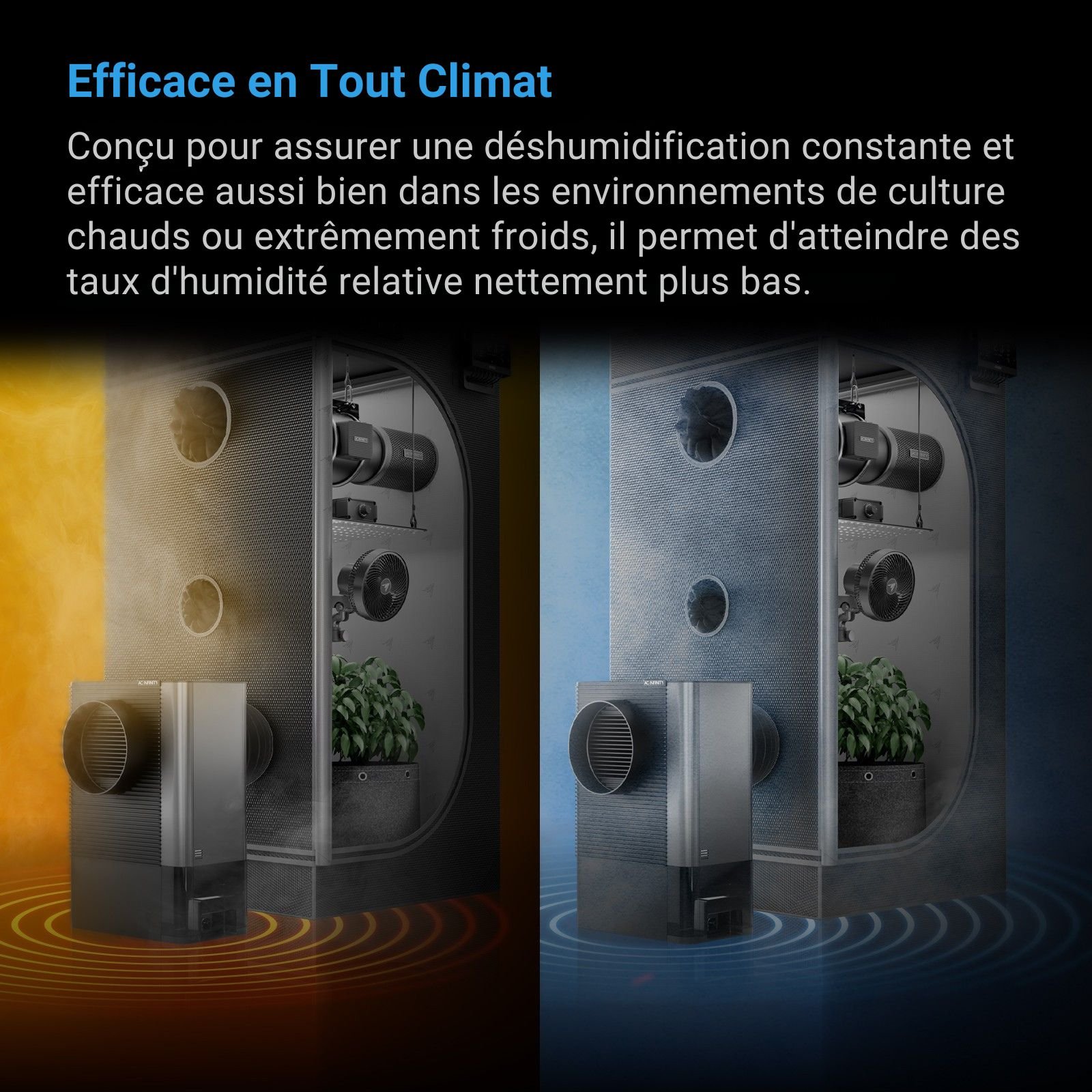 L'efficacité thermique constitue un atout majeur de ce système innovant. Les performances restent constantes, que votre espace de culture soit soumis à une chaleur intense ou à un froid rigoureux. Cet appareil peut abaisser le taux d'humidité relative jusqu'à un seuil de 25 %. Une telle polyvalence garantit la santé de vos plantes durant toutes les phases de leur cycle de vie. Vous évitez ainsi les risques de moisissures ou de maladies fongiques liés à un air trop saturé.