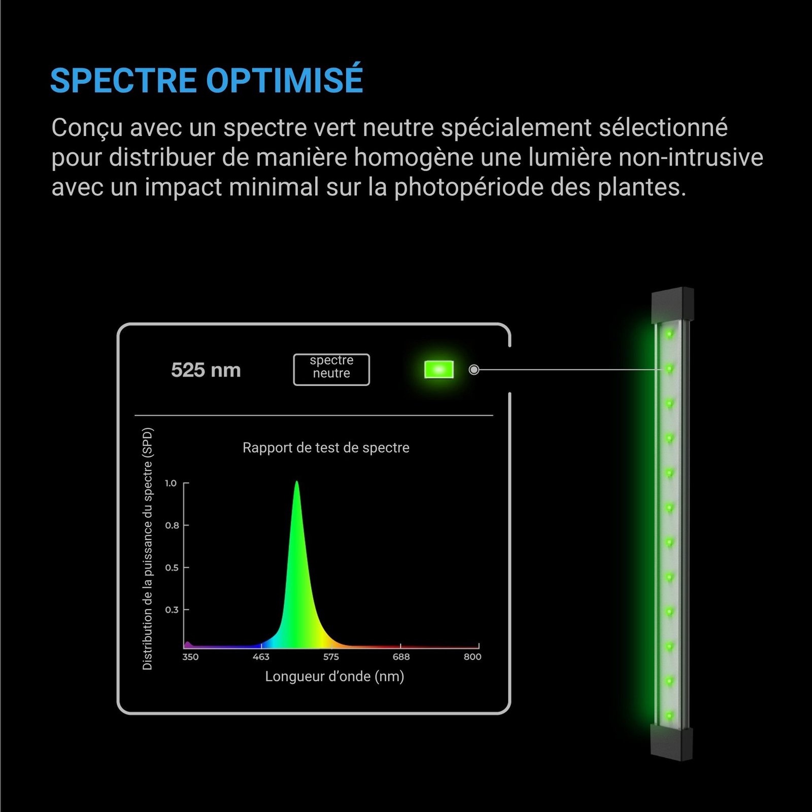 • Cette barre lumineuse utilise un spectre vert spécifique que les végétaux n’absorbent pas, prévenant ainsi tout risque de stress.