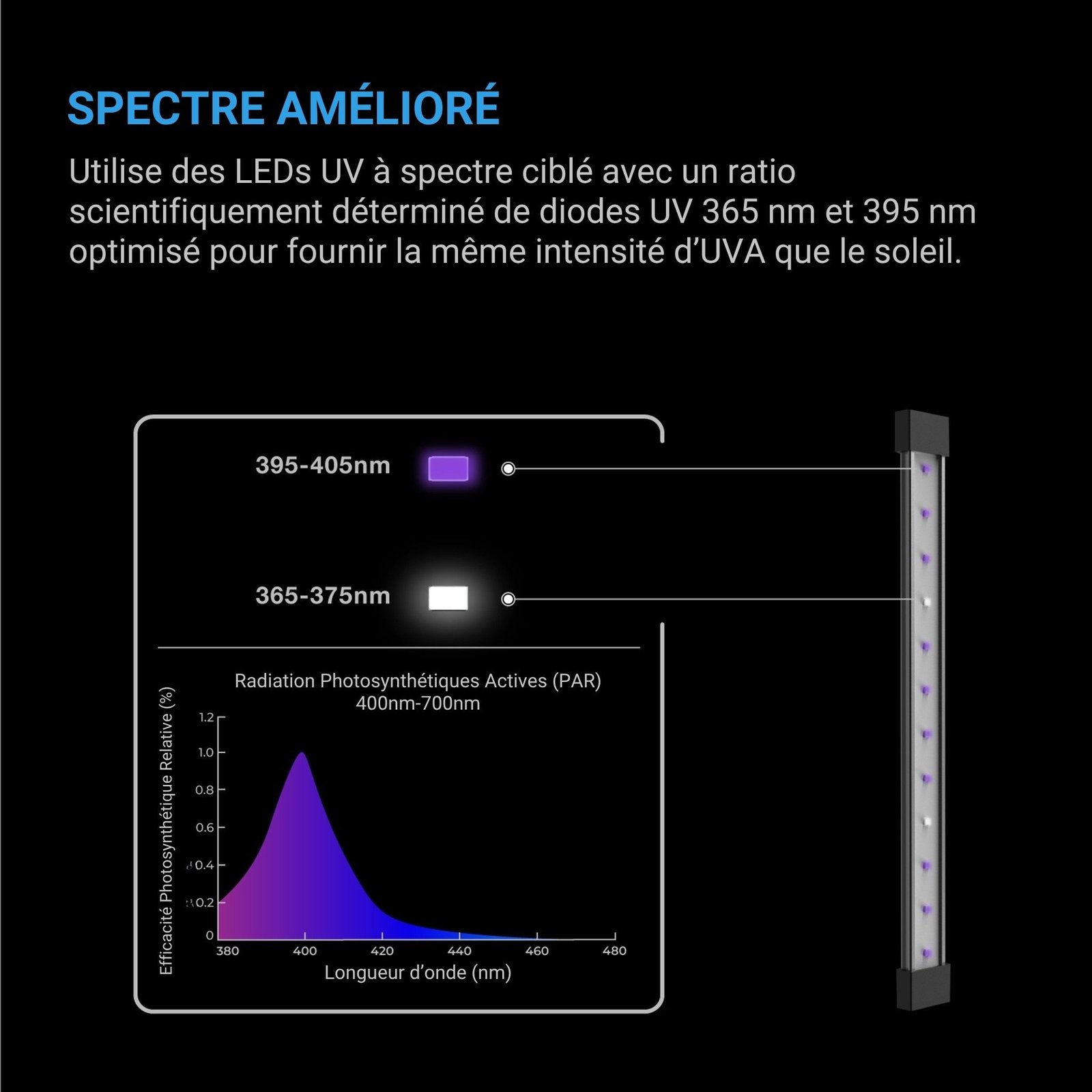 Les puces LED intégrées diffusent des longueurs d'ondes stratégiques de 365 nm et 395 nm afin de provoquer un stress bénéfique chez le végétal. En conséquence, la plante réagit en produisant une barrière protectrice riche en huiles essentielles et en molécules olfactives complexes. De surcroît, ce spectre spécifique aide à maintenir une structure de plante compacte en limitant l'élongation excessive des tiges. Vous obtenez ainsi des fleurs plus denses et une qualité de produit fini nettement supérieure aux méthodes classiques.