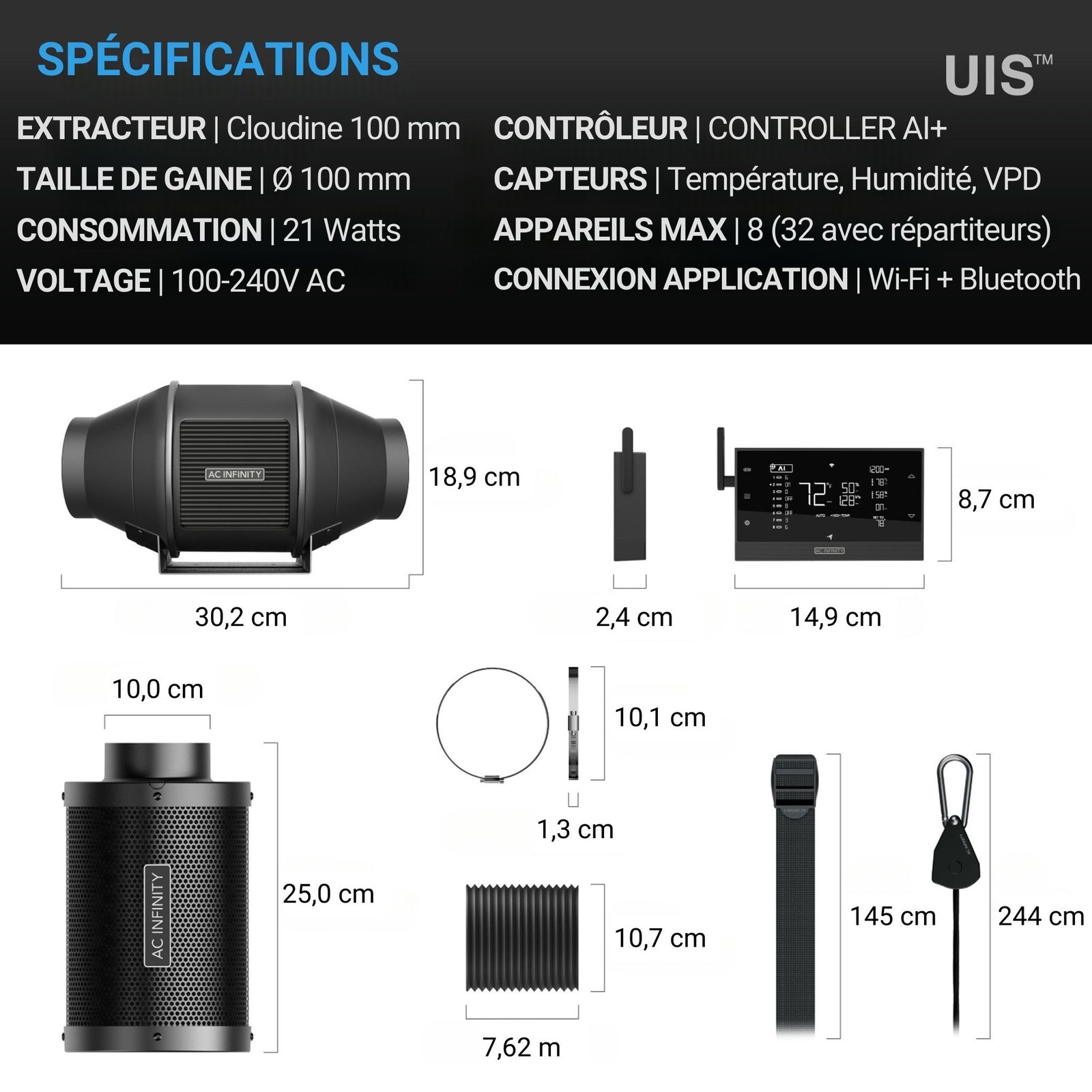 AC INFINITY Kit de filtration 100 mm, Extracteur d'air avec Controller AI+, Filtre à charbon & Gaine