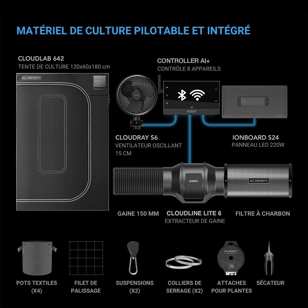 - Un kit de tente de culture avancé avec des contrôles intelligents et des composants intégrés pour démarrer un système de culture en intérieur.