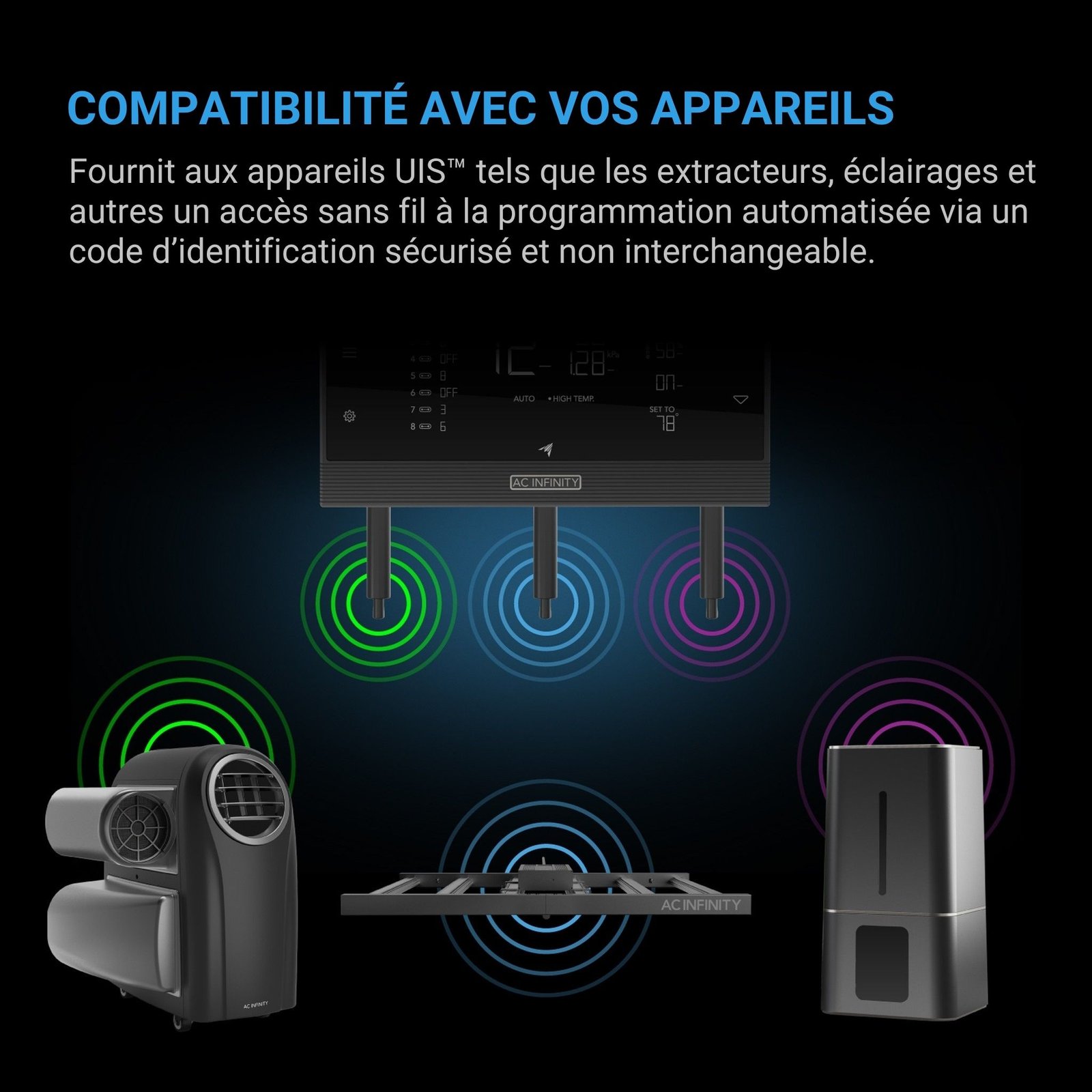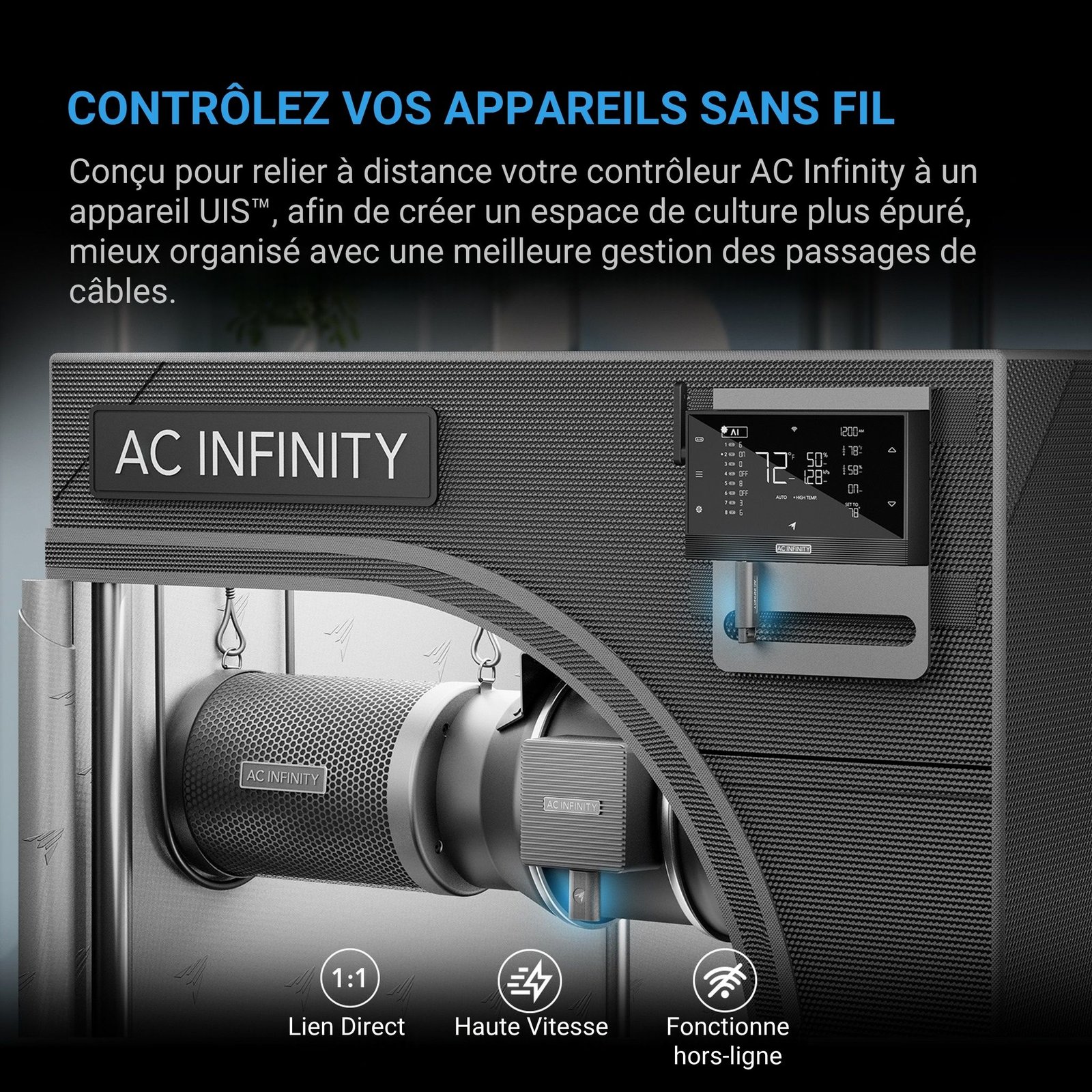 - Connecte sans fil les contrôleurs AC Infinity aux ventilateurs, éclairages et appareils intelligents UIS pour des espaces de culture organisés et sans câbles.