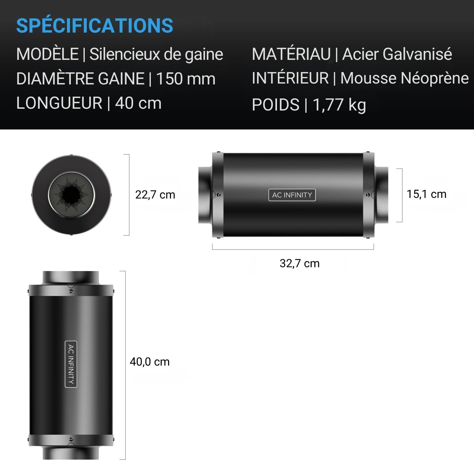 • Diamètre de l’ouverture de gaine : 150 mm | Longueur : 40 cm | Poids : 1,77 kg